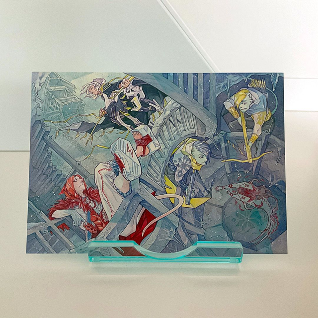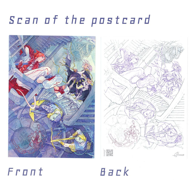 A DIN A6 sized artprint. It depicts an old batch of my OCs and will not be restocked. On the back there is the lineart version of the artwork.
