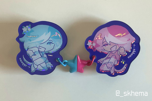 Acrylic magnet pins depicting my OCs Copper & Zinc. It comes as a set of two pins and acts as a "connector" pin. The star bead is a small magnet.