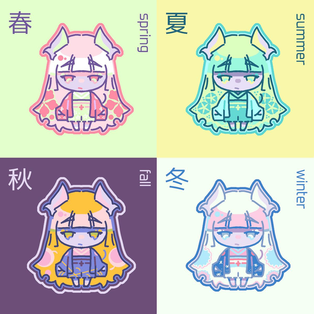 The designs depict my bonzai tree gijinka OC who changes hair colour depending on year's season.