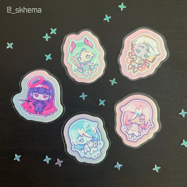 A set containing five tiny stickers. Each is 2.5cm or 1 inch size and has a strong, long lasting glow-in-the-dark effect. The designs are each OCs from my manga.