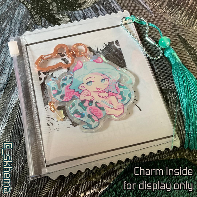 The 2.5 inch (or 6,3cm) sized charm inside the PVC bag on the photo is for display only!
